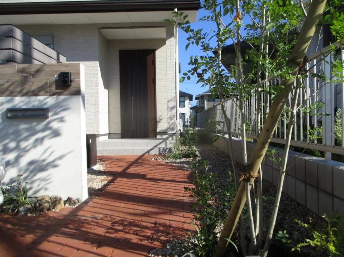 レンガでカーブを描いたアプローチと植栽の組み合わせで柔らかい雰囲気を演出。
