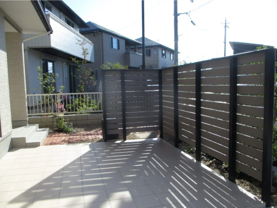 広々としたタイルのテラスに目隠しフェンスを設置することでプライベート空間に(^^)/
