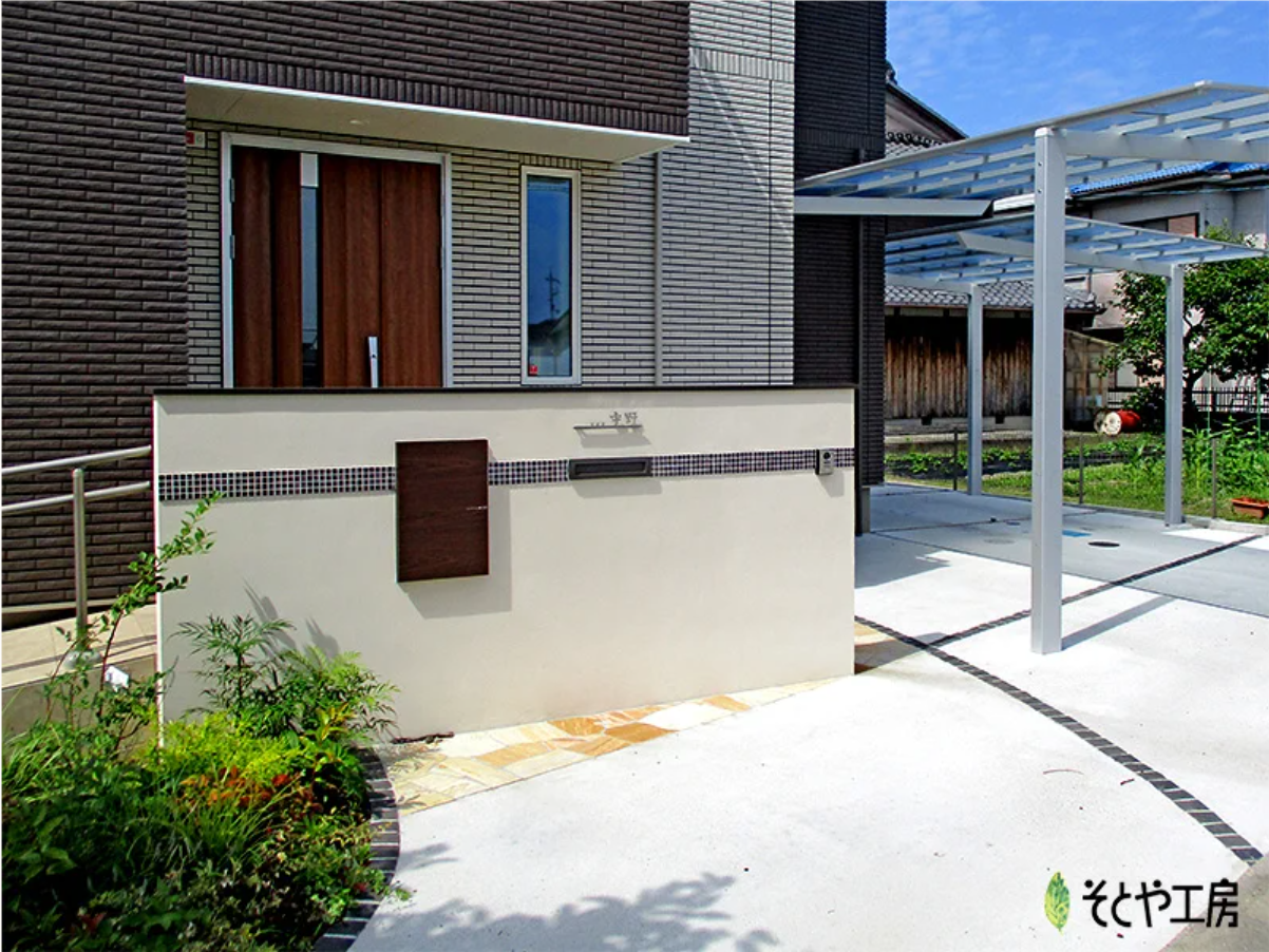 玄関前は道行く人の視線が何かと気になる・・そういうお悩みも外構で解決! 玄関ポーチが広々と作られていたので、目隠しも兼ねて大きめの門柱を設置。 モザイクタイルのラインをアクセントに、建物のツートーンカラーと合わせたシンプルデザインに。 宅配ボックスはしっかりと容量あるユニソンの「ヴィコDB120」を採用、玄関前にあると使い勝手もよく便利です