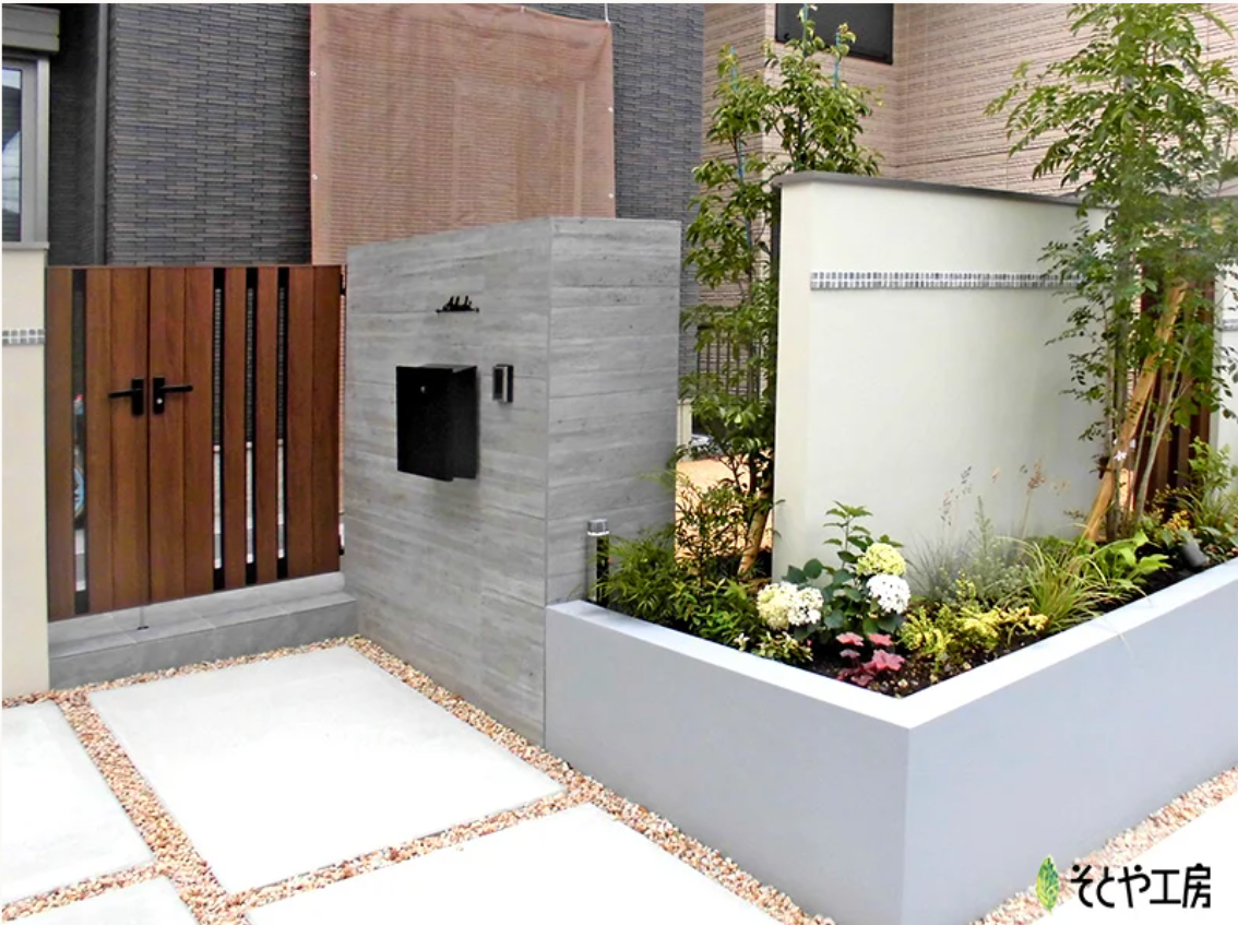 しっかりと目隠しをしつつ、かつ暗くなってしまわないように壁と角材、植物との組み合わせで 圧迫感のない、クローズ外構に。