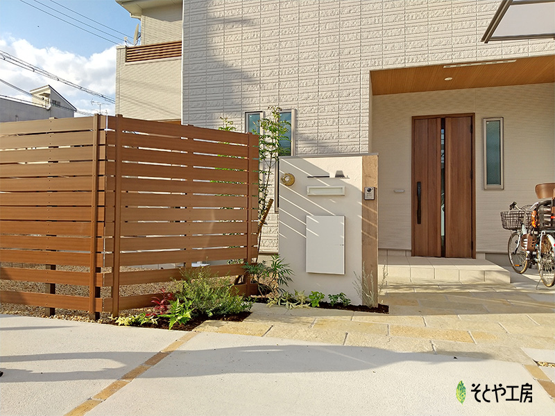 目隠しフェンスと植栽でプライベート空間を確保しつつ、風通しをより良くするため、フェンスの下側のすきまを広くする等ちょっとした工夫を取り入れました。