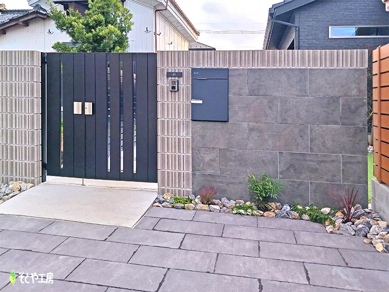 以前門柱部分を工事したお宅の周辺の舗装工事です。 門柱・門扉のシックな色合いに合わせ、深みのある舗装材を使用しました。 大判で自然な色むらがあるため、モダンの中にもナチュラルな風合いの仕上がりになります。