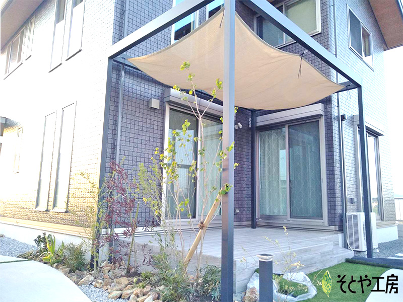 シックな色でまとめたテラススペース。 植栽の色が映えるお庭です。 広々とした空間にあえて屋根はつけずフレームのみにし、シェードを付けて日射しをコントロール。 風を感じながらゆったり家族の時間を過ごせる素敵な空間です。