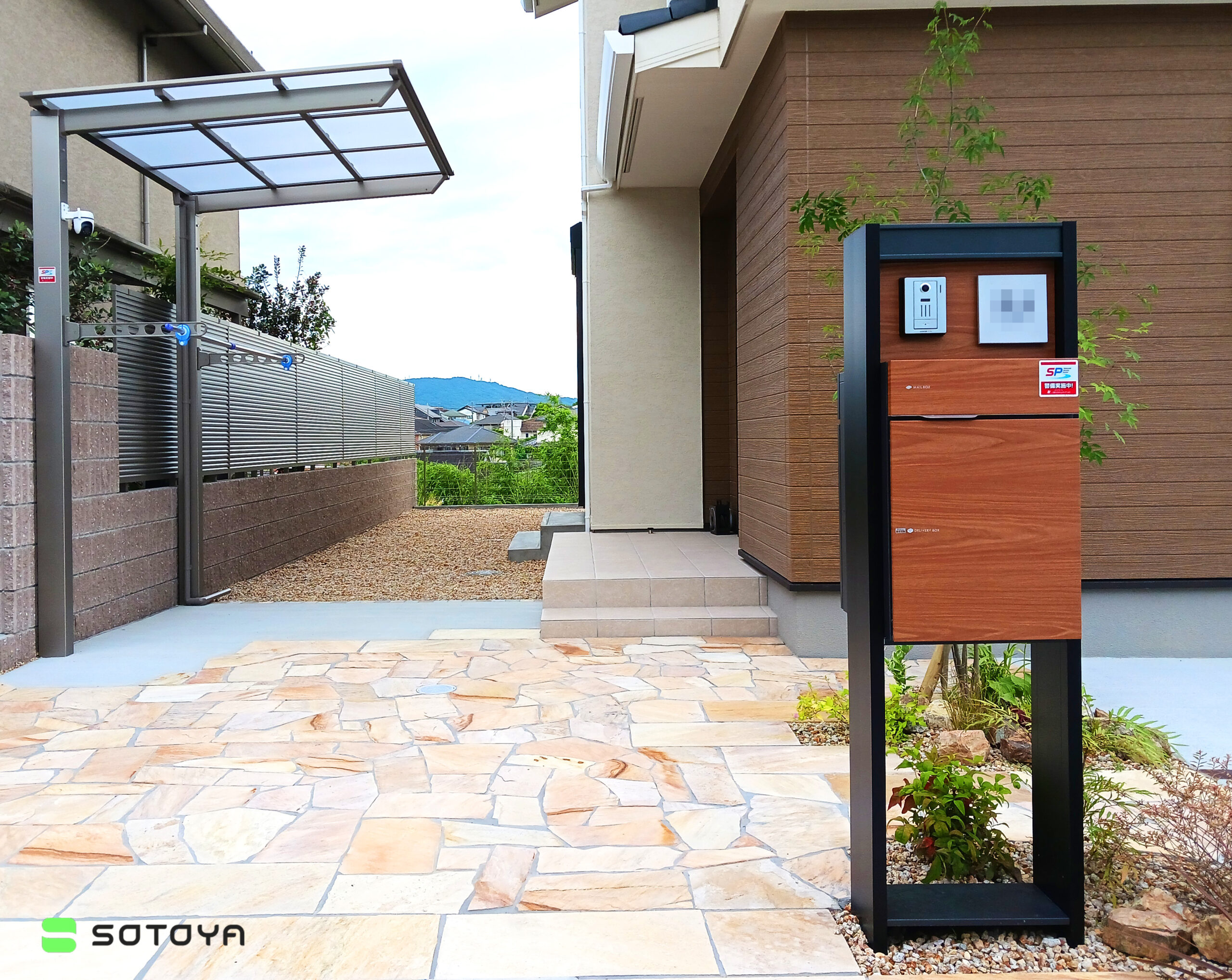 家の外壁に合わせて、門柱は明るめの木調を選択。