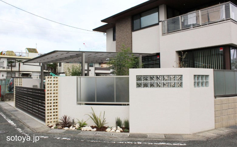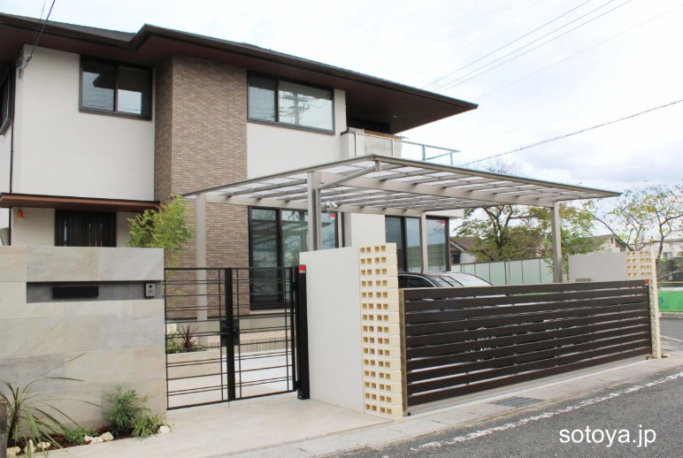 新築滋賀栗東店ガーデンデッキ・テラス・ガーデンルームアプローチ門柱・エントランス塀・フェンス・目隠し駐車場・カーポート装飾・アクセント植栽