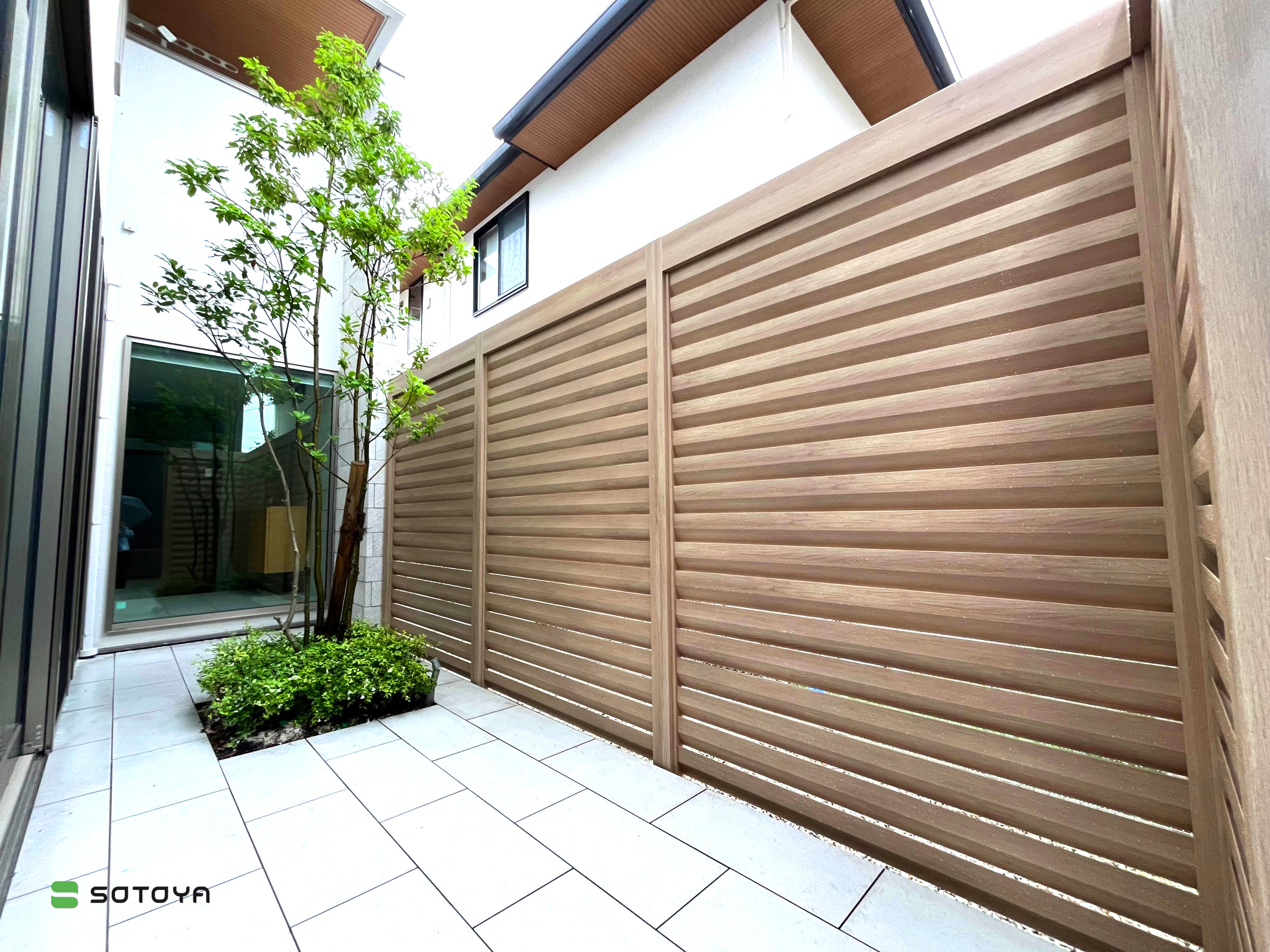 もともとあったタイルテラス。 様々な方向からの視線を気にすることなくカーテンを開けたまま過ごすことができます。 ルーバータイプで風を通します。