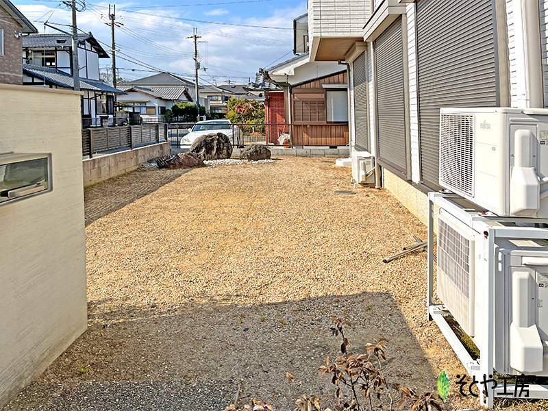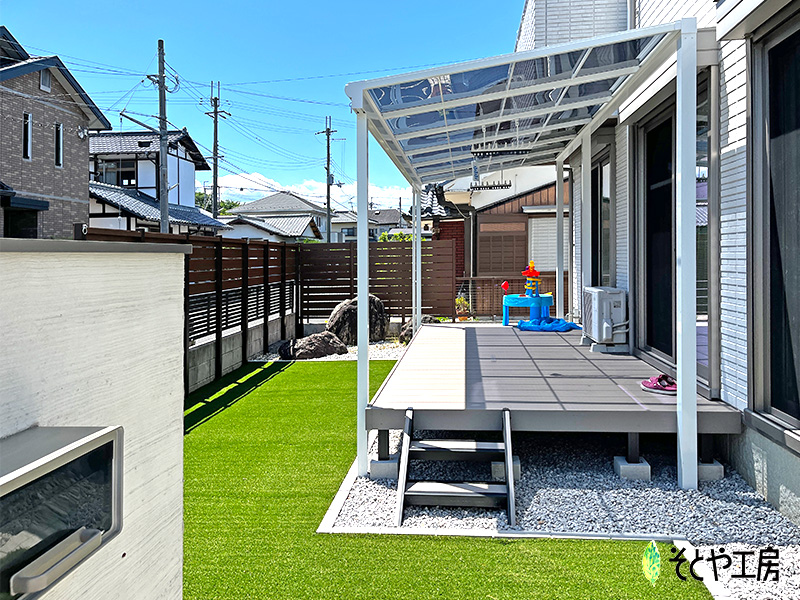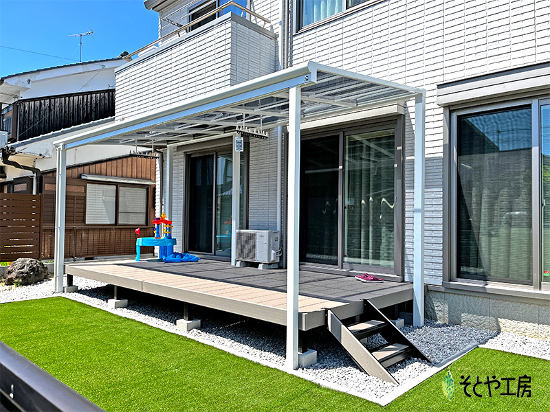 お庭を満喫できるウッドデッキとテラス屋根を設置しました。 室外機はウッドデッキの上に移設し、雨水桝には点検ハッチを設けるなど細かな納まりをお客様とも話し合いながら工事を進めていき、完成したお庭にとても喜んで頂きました。 ウッドデッキは三協アルミのひとと木。 従来品よりも温度上昇を抑えてこの春リニューアルしました。 新色のサンドグレーです。