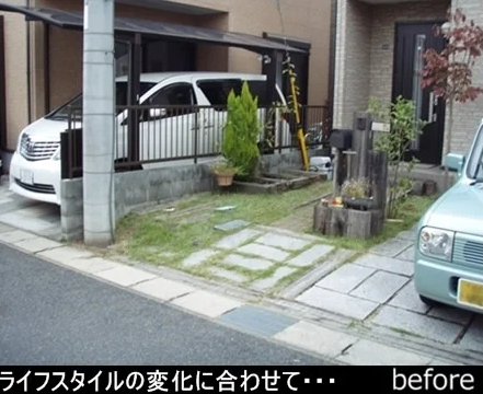 ライフスタイルの変化に合わせ、お庭のリフォーム☆ 老朽化した門柱をやりかえ、自転車置き場を新たにつくりました。内柱うらに自転車置き場をつくることで、自転車を道路から見えにくくしています。