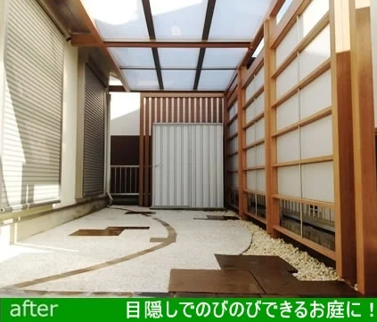 ご近所様からの目線が気になって、庭がうまく使えてないという相談でした。+Gのかすみ調の目隠しや屋根を使用することで目線や天候を気にせずお庭が楽しめるようになりました。