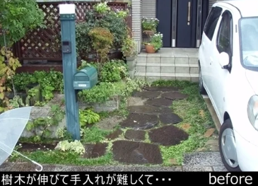 樹木が自由に伸びて手入れがしにくいエントランス部分を、既存の石がなじむようにコンクリートではなく土で固めた舗装で仕上げ、門柱もウッドカラーに変更して統一感を演出しています。