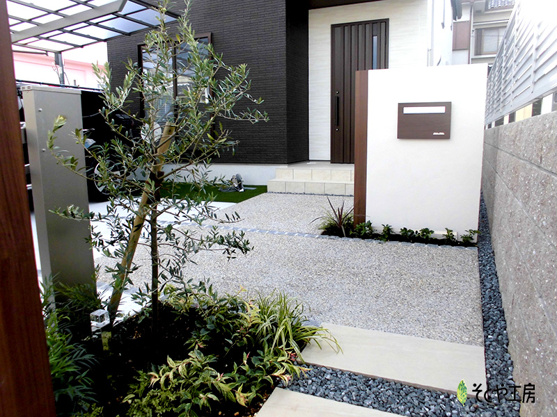 アプローチはタイル敷きと砂利洗い出しで仕上げ、植栽で彩りを。