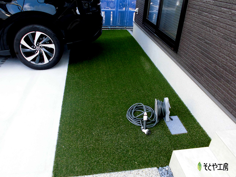 ガレージのタイヤが乗らないスペースには人工芝を敷くことでより明るい空間になり、小さいお子様が遊びやすい空間を作りました。