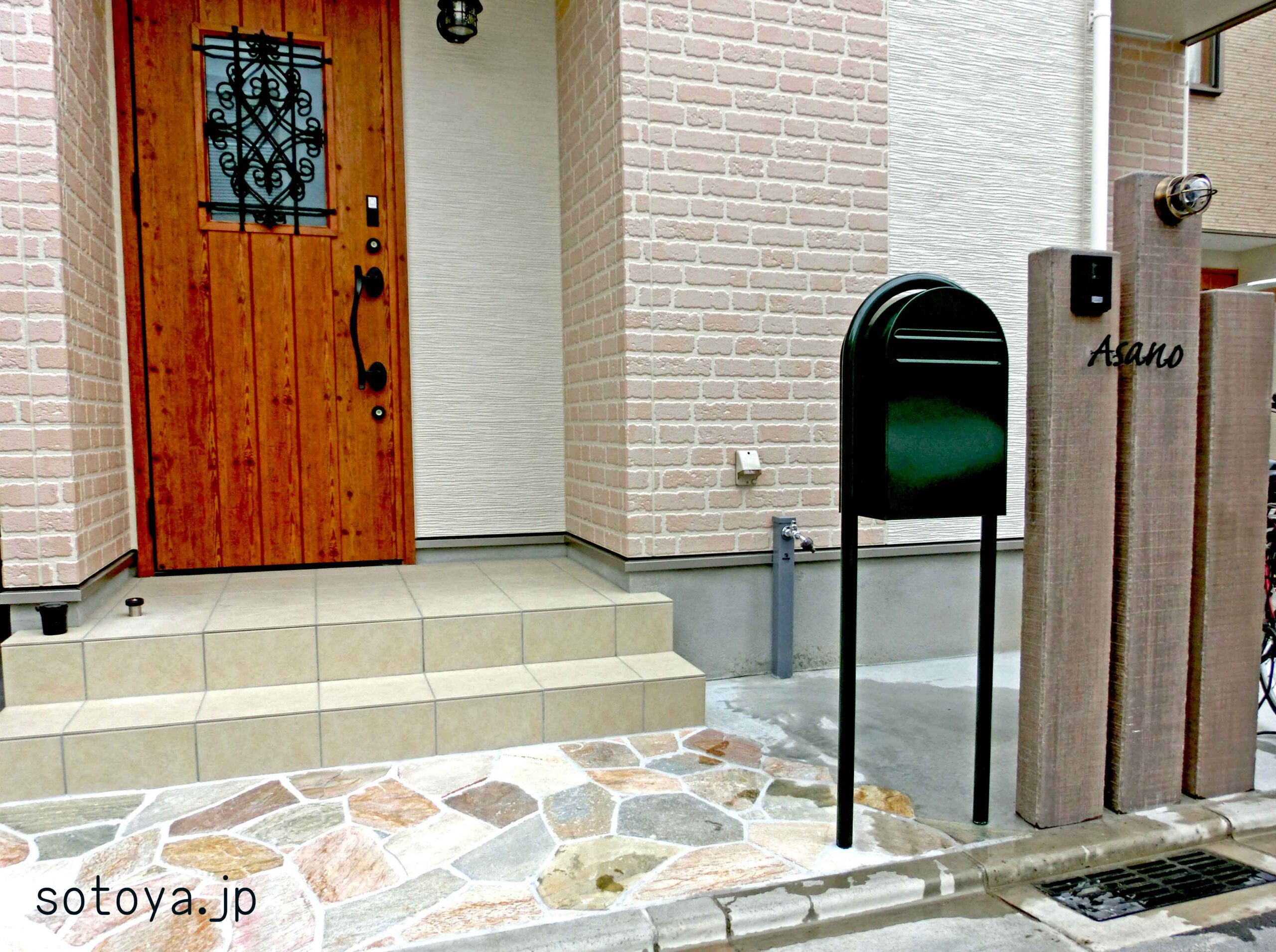 洋風の建物が引き立つ、かわいい、でも甘くしすぎないファザードをご提案させていただきました。 門柱のコンクリート製枕木は近くで見ると凹凸感があり、ナチュラルなテイストを作ってくれます。 そのお隣に並んだポストは深いグリーンでツヤもある甘辛コンビ。実はそっと、後ろの立水栓が目立たないよう、ずっとそこに立ち続けてくれます。