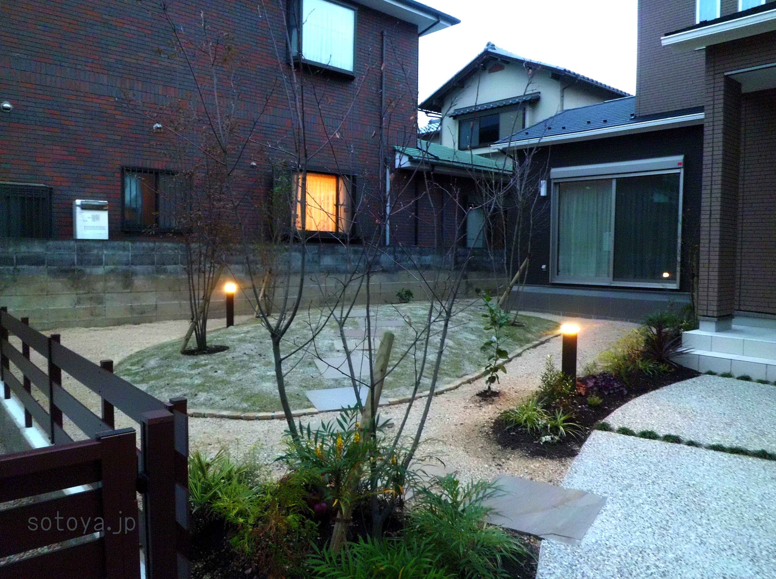樹々の中をくぐり抜けていくような園路が特徴のお庭。 タカショー エバーアートポールライトのあたたかな照明でお庭がより一層引き立ちます。 芝生と土の境界にピンコロ石を並べることで見切りを作り、管理のしやすさも考えました。新緑の季節が楽しみです。