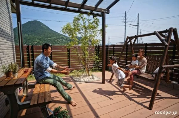 人工木材のウッドデッキとフェンスを使い、メンテナンスフリーな家族団らんのスペース。