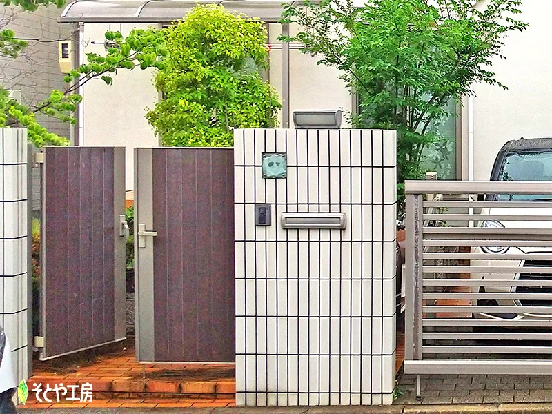 車を2台停めるには少し狭かったガレージを拡張するために跳ね上げ門扉や門柱などをすべて撤去し、オープン外構にしました。 門柱を前と後ろに互い違いに配置し、道路から少し奥まった位置に再配置することで、車の出入りがしやすくなります。 がらりと雰囲気が変わり、モダンな仕上がりです。