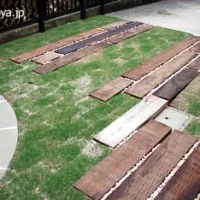 お庭のスペースには芝生を貼り、轍の場所には枕木を埋めてアクセントと実用を兼ねて。