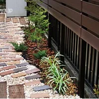 砂利に暖色系のレンガや枕木を埋め込んで明るい雰囲気になりました。