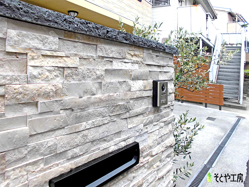 シンプルな機能門柱を撤去し、新しく石貼りの門柱を新設しました。 隣地との境界には樹脂フェンスを。 隠したい場所によって高さを変えて施工。 門柱とフェンスと植栽が相まって、お洒落な雰囲気に仕上げました。