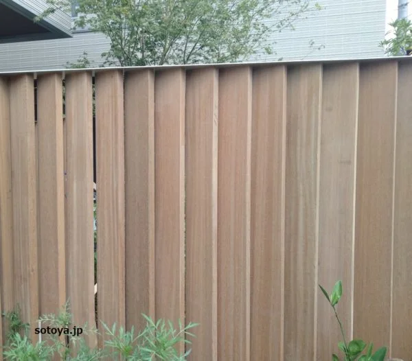 天然木のセランガンバツ材というハードウッド材を採用し、縦格子をルーバー状(細長い板に隙間をあけて平行に組む)につなげて、ご要望をかなえる形で目隠しをご提案しました。