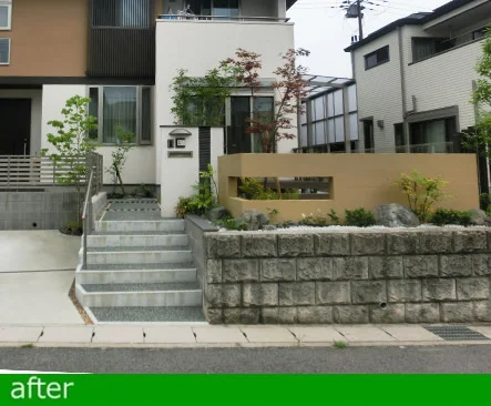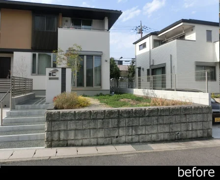 南向きのお庭のスペースを有効利用する為、横長の壁と高木で目隠し、自由度の高い壁面をつくり出せるフィットウォールという躯体構造でコーナーに穴をあけ、軽やかさを演出しています。