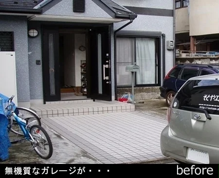 全体的に無機質な印象のガレージを温かみのあるものに・・とのご依頼でした。 ガレージ床には天然石や洗い出し、下草で色付けをし、門柱やシンボルツリーを設け、縦の立体感・奥行き感も作りました。 隣地境界のブロックも木調の板でしっかり目隠し!外回りの完成度が高まります。