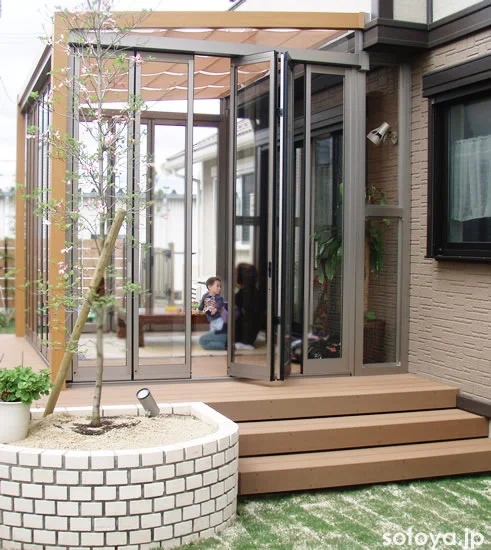 サンルーム(TOEXジーマ)をより広く使うため、2Fバルコニーより屋根を取り付けました。またデッキでくつろぎながら植栽を楽しめるように、デッキの高さまで花壇を積み上げました。デッキからの転落防止にもなっています。