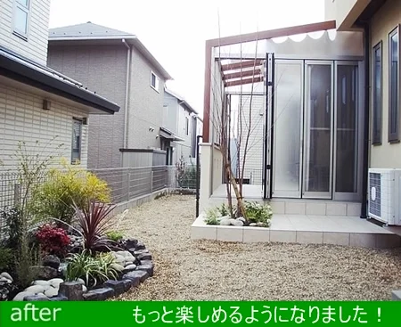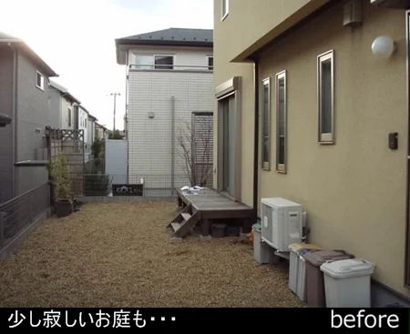近所の視線が気になり、使わずじまいだった庭とウッドデッキ。これらと、リビングが広く感じるガーデンルーム(cocoma)を設置。ガーデンルーム内からも庭を楽しめるように、手前にカツラの木を植え奥上花壇を配置。庭に奥行きを与えました。