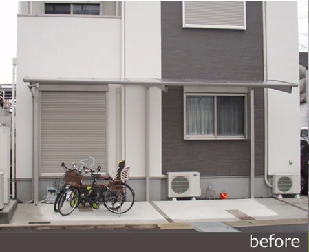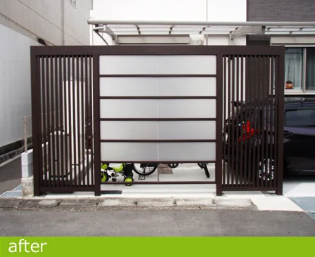 駐車場を残し、門まわり、アプローチ、庭部分を改装する工事。気にされていた、周囲からの目線を背の高いフェンスでシャットアウトしました。