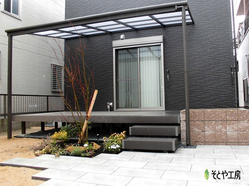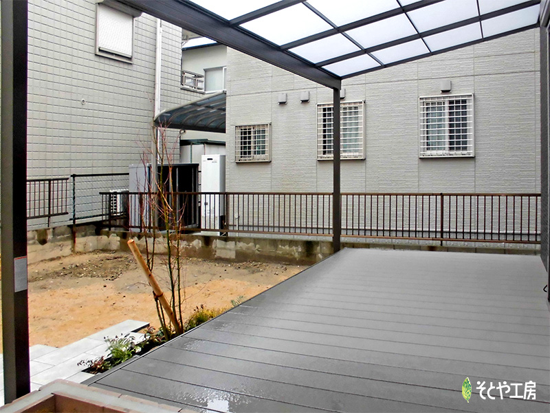 室内からの繋がりをもたせた広々とした樹脂デッキにテラス屋根を設置、お庭でゆっくりと過ごせるような空間にしました。 また窓から出てすぐに収穫できるよう菜園スペースを設け、デッキから降りた場所ではBBQができるようタイルペースも。 充実したお家時間を楽しんでもらえるようにデザインしました。