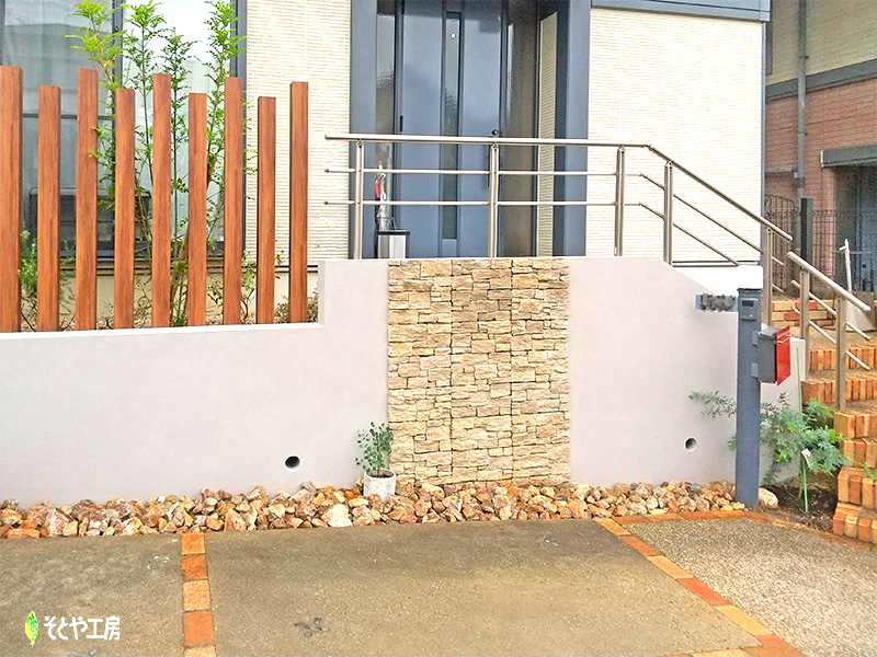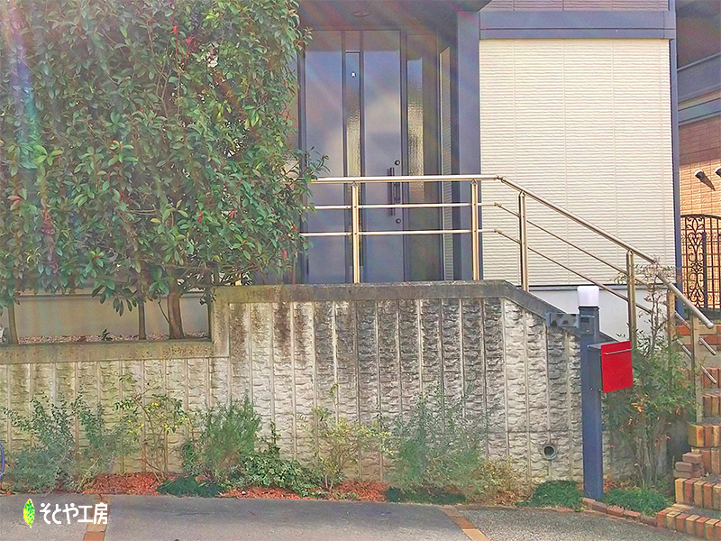 長年の汚れで黒ずんでしまった塀を塗直しさせていただきました。 部分的に天然石を張り、高級感もありつつスッキリきれいな玄関周りとなりました。 玄関横の窓の前には生垣がありましたが撤去し、軽い目隠しを兼ねて枕木材を設置させていただきました。 玄関周りがきれいになるとお家自体もきれいに新築同様に見えてきますね!