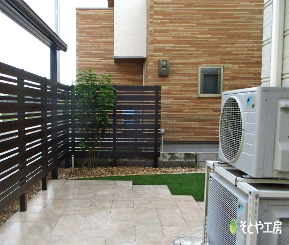 遊び盛りの子供たちが走り回って笑顔になれるような、そんなお庭にしたい!とのご要望で、人工芝と、一部BBQの焼き場にもなるようなタイルテラスをご提案しました。
