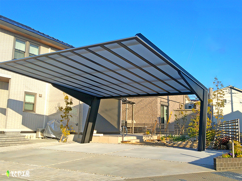 後方の2本の支柱で支える独創的なデザインです。 また、柱が内側に入り込んでいるため見た目も美しく敷地の中でとても存在感を感じるカーポートとなっています。