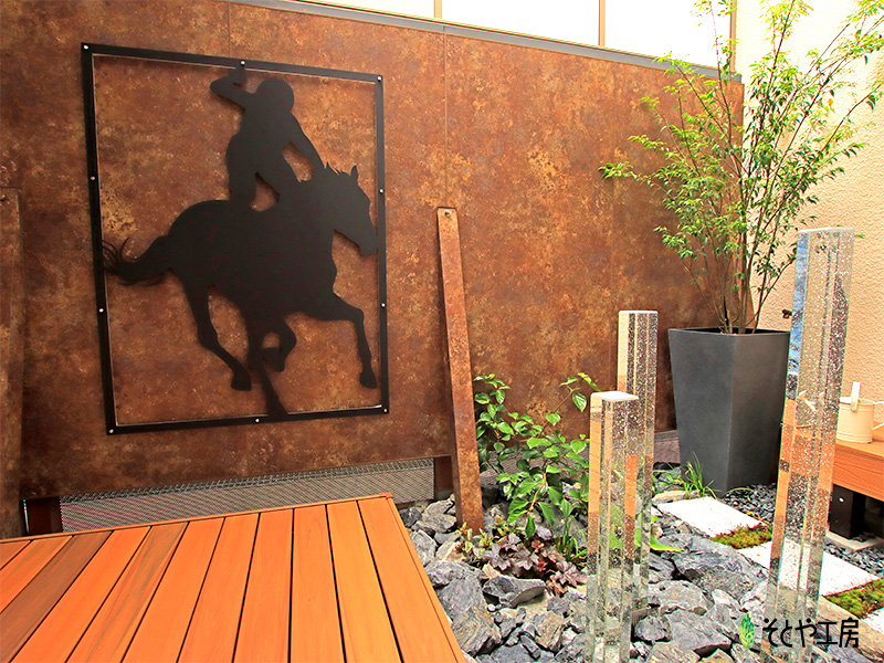 勢いを感じるジョッキーと牝馬のシルエットはタカショーにオーダーして制作したデザインパネルです。