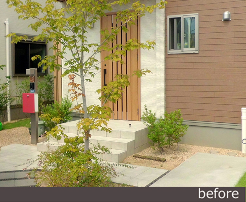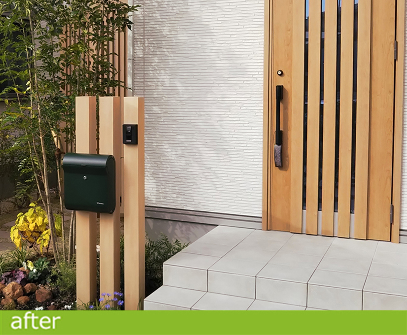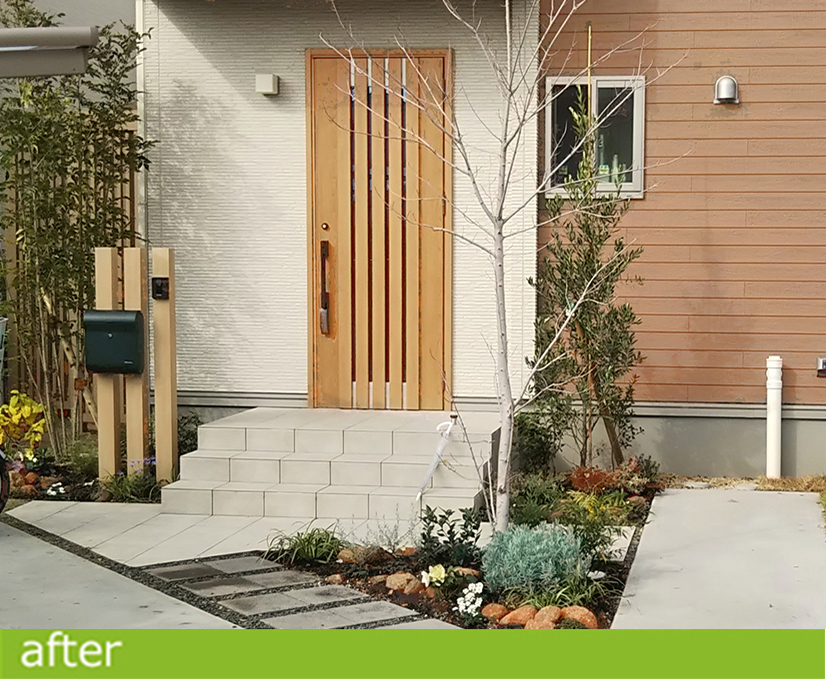門柱まわりや植栽計画を変えるだけで、建物と統一感のあるナチュラルな外まわりに。 既存のシンボルツリーが芽吹くころには、より華やかな門まわりになることでしょう。