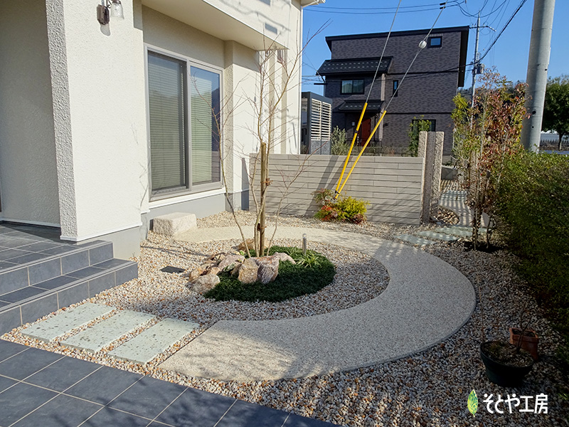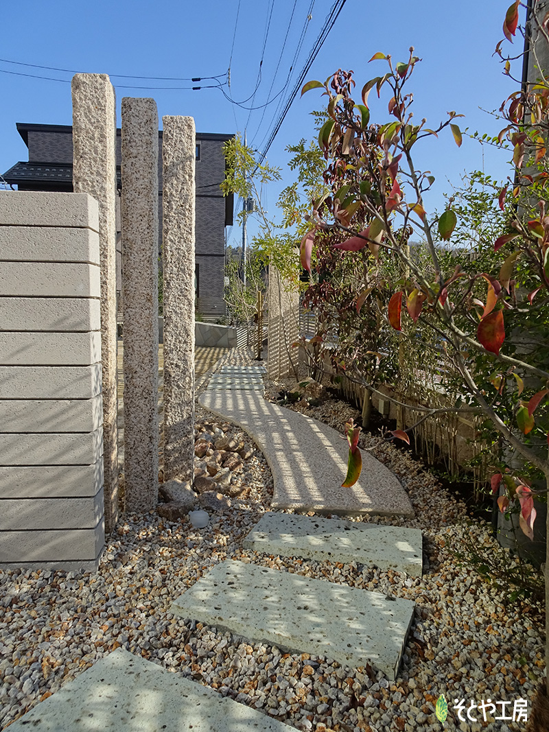 アプローチをシンプルかつ大胆に描き、お庭と一体化させました。 シンプルだからこそ素材は本物を。 飛び石には大谷石を使用し、経年変化による移ろいもまた味わいです。