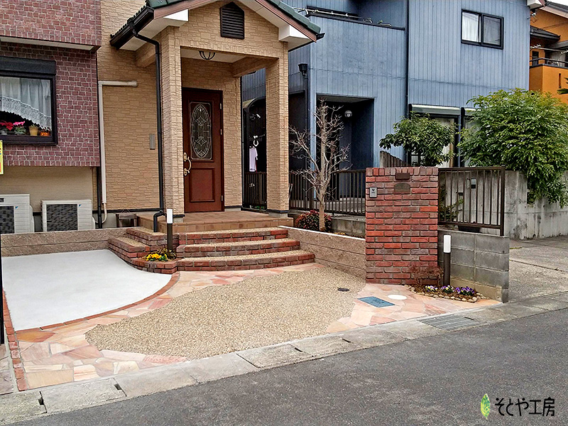 元々の外構が醸していたレンガや乱形石の雰囲気は建物にマッチしていたので、その雰囲気はそのままに、