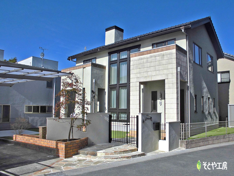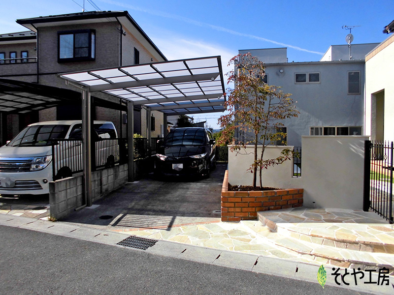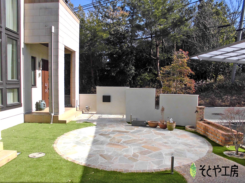 ご家族でBBQやお庭での食事を楽しまれたいとのご希望から、お庭の中央に広々としたサークルを作りました。 丸い形には包容力と心を和らげる力があるのではないかと思います。 ここが新たに家族団欒の場になる風景が目に浮かんできます。 また、門柱まわりも一新し、お庭の目隠しを兼ねつつ建物の雰囲気にマッチするようデザインしました。