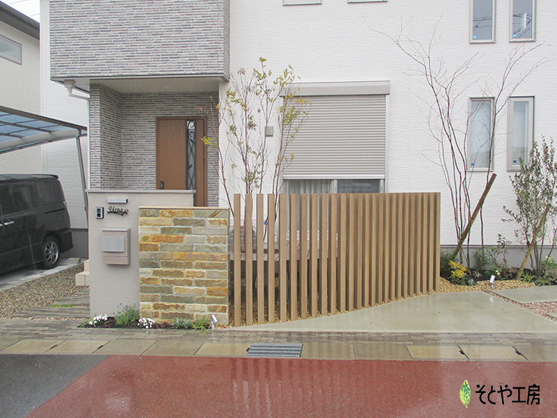 デッキ前に並んだ木調の枕木材は何度も何度も太さやすき間のサイズを検討し、門柱前の石貼りの化粧塀も時間をかけて選んだ石材を使用。