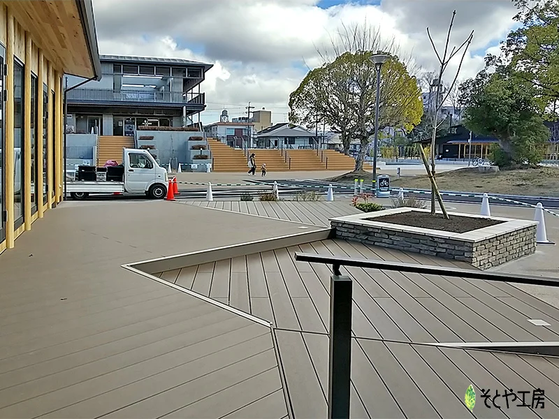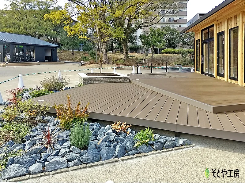 広場に設置したウッドデッキは、角度をつけてあらゆる角度に配置し、空間に広がりを持たせました。 一面一面テーブルを置いて寛げるようサイズにも配慮。 鋭角の先にはロックガーデンを設け、木々や草花を見ながら長居してもらえるような工夫も設けました。