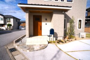 外構プランでは、ポスト・アプローチ・駐車スペースを一体的にデザインし、直線だけでなくやわらかな曲線を取り入れることで、住まい全体に優しい印象を与える外構に仕上げました。